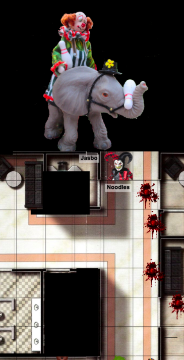 More glitching. D311B0i gets shot down. Another clown takes their place, Noodles. Noodles starts dragging the trainee’s corpse down the hallway. Why is there an elephant flying 40 stories up? Oh, it’s feeding time. Cops for breakfast.