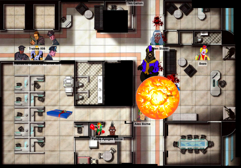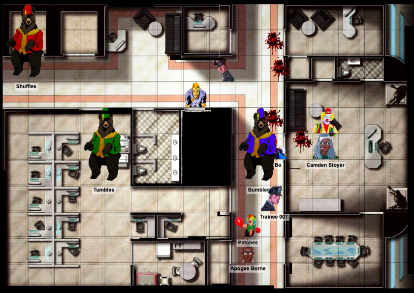 The bear grabs Alex, and in a familiar tone asks her to stand down. Only D311b0i is that polite. Next he addresses the cops. “Something is wrong. The game is broken. We need to stop shooting each other.” A talking bear is enough to give pause, and start a conversation. Camden asks about the clowns. The cops don’t see clowns, but one of the trainees is attacking another. Elevator goes ping. More bears! Acts of non-violence and restraining the hostiles gets us enough trust. After taking out the other bears, we let the timer run out.