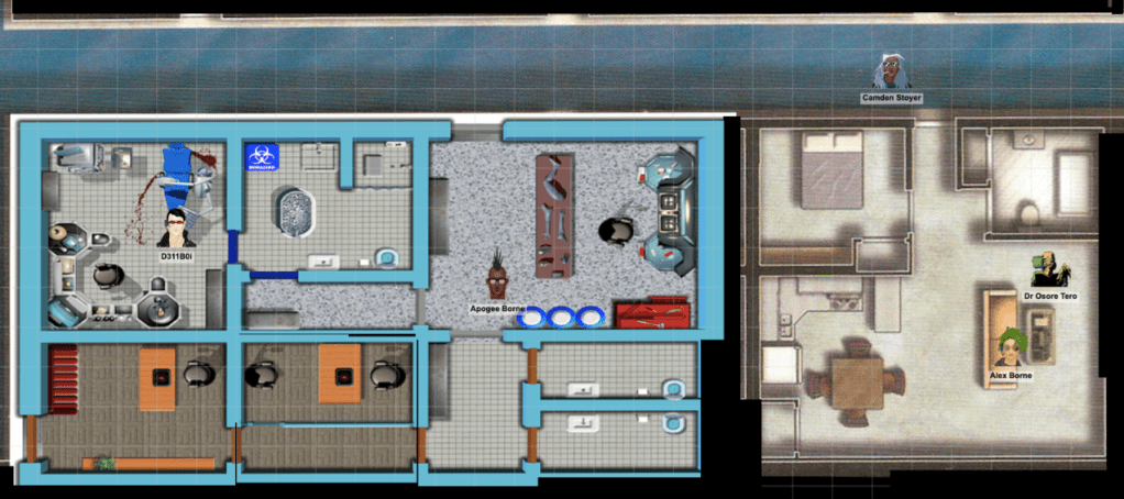 Waiting room. Consultation office. In the back another set of reinforced doors. There was a keypad, but best let the tech take care of this. By this point Alex and Apogee Borne had been released from the police station. Camden went back and picked them up. They were in a dour mood. But, Alex’s mood brightened when Camden mentioned that Dr. Tero was around since he’d offered to fix her netrunning gear.